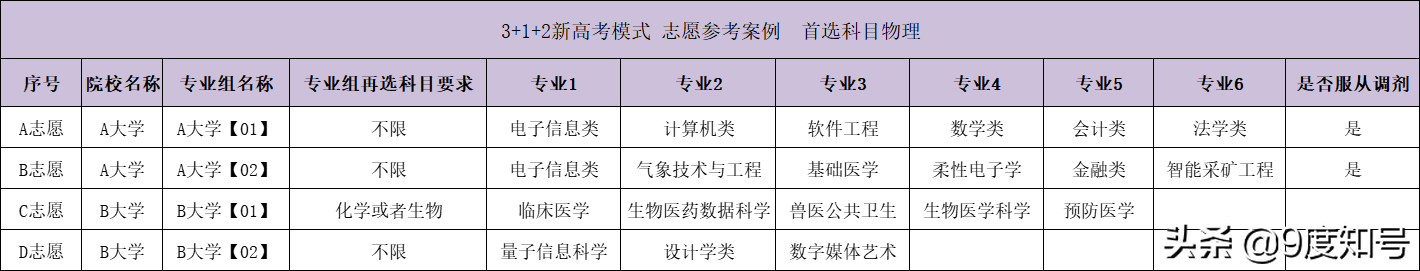 除高水平艺术团、高校专项计划和高水平运动队以外,采用的是院校专业组的志愿模式。院校专业组则是一所院校可以设置一个或者多个专业组,每个专业组下只能6个专业。