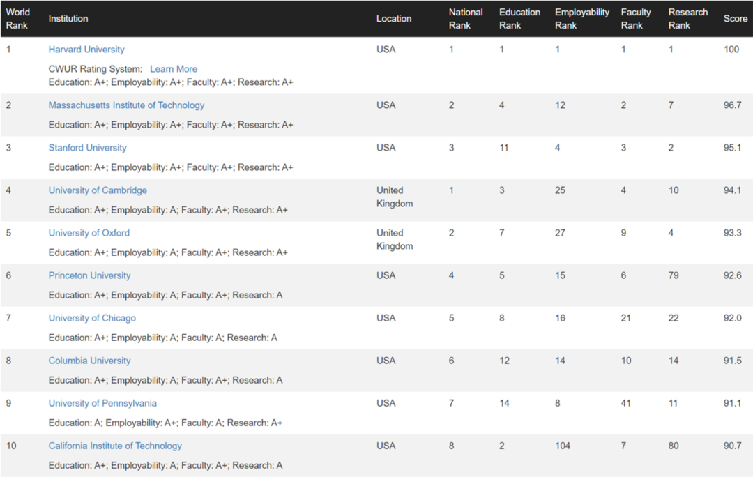 要知道,哈佛在CWUR上已经连续11年蝉联第一。
