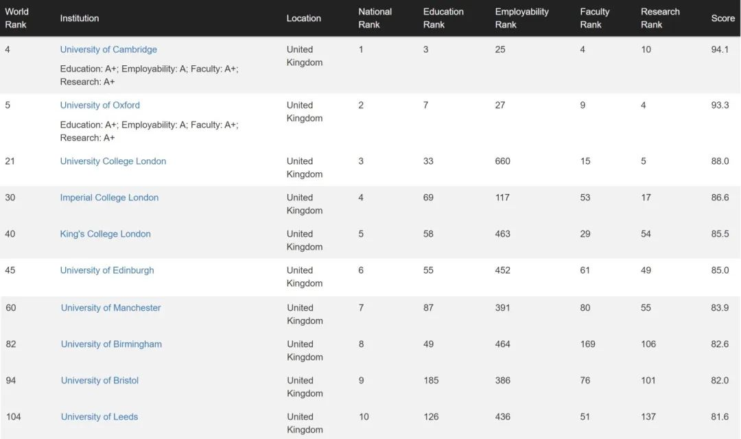其中有4所高校进入全球Top30,依次是:剑桥、牛津、UCL、帝国理工大学,分别位列全球第4名、5名、21名和30名。