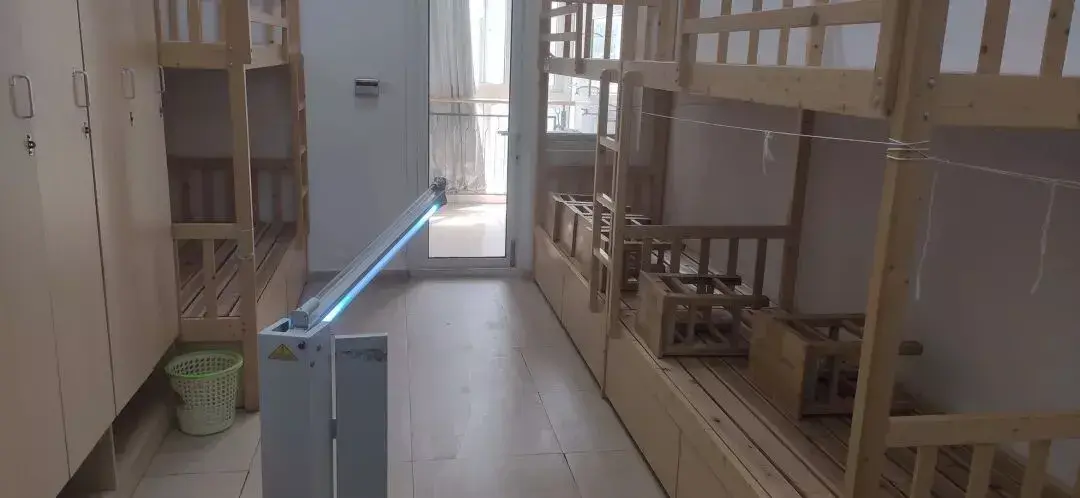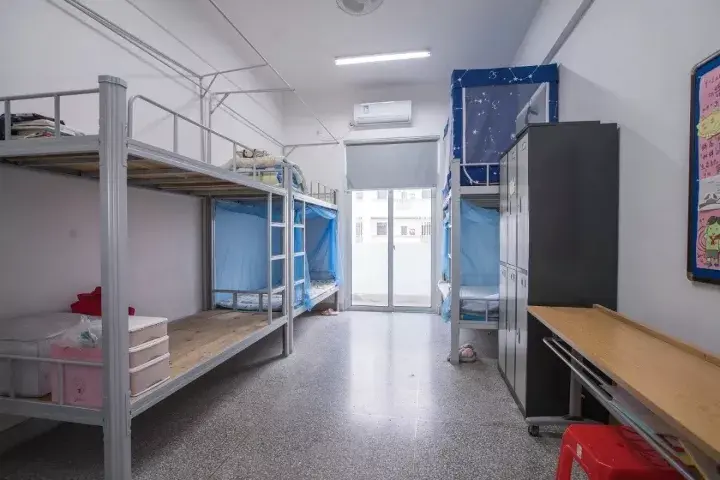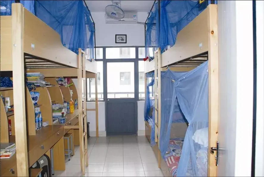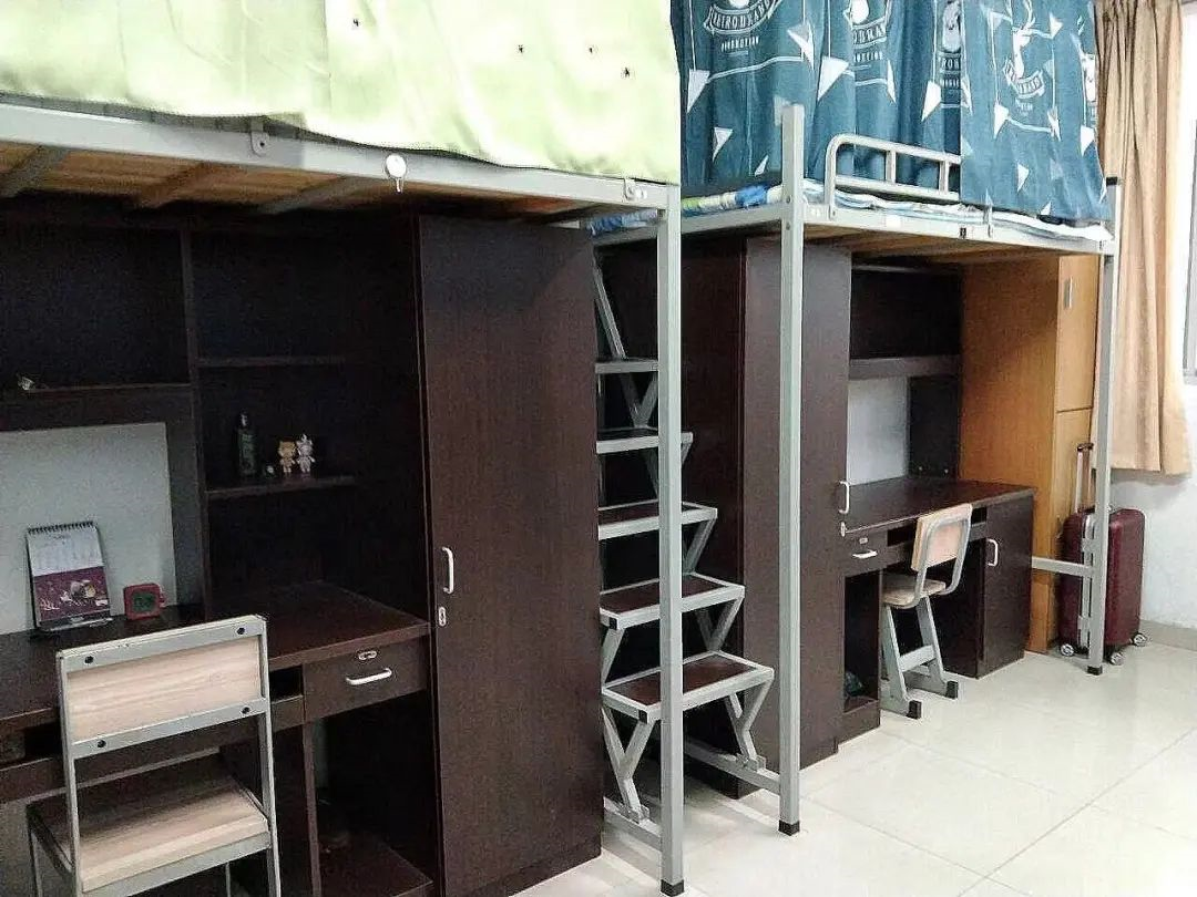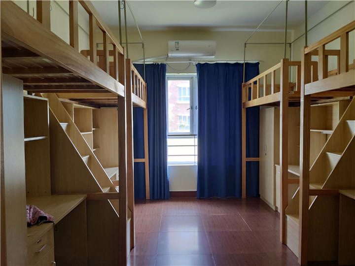 4人一间的房间,十分宽敞。下面是桌椅,上面是床铺。一节短梯供学生上下,梯旁设有好几节且宽度较宽,防止学生滑倒。有空调,热水器,饮水机,微波炉等方便学生使用。