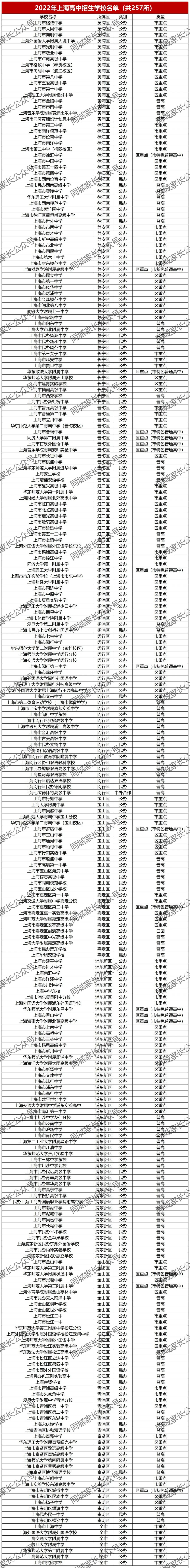 6月11日,市教育考试院发布重要消息,2022年上海市高中招生学校名单公布,全市共有257所高中参加中考招生,其中市重点73所(含市重点分校),区重点87所,普高97所。