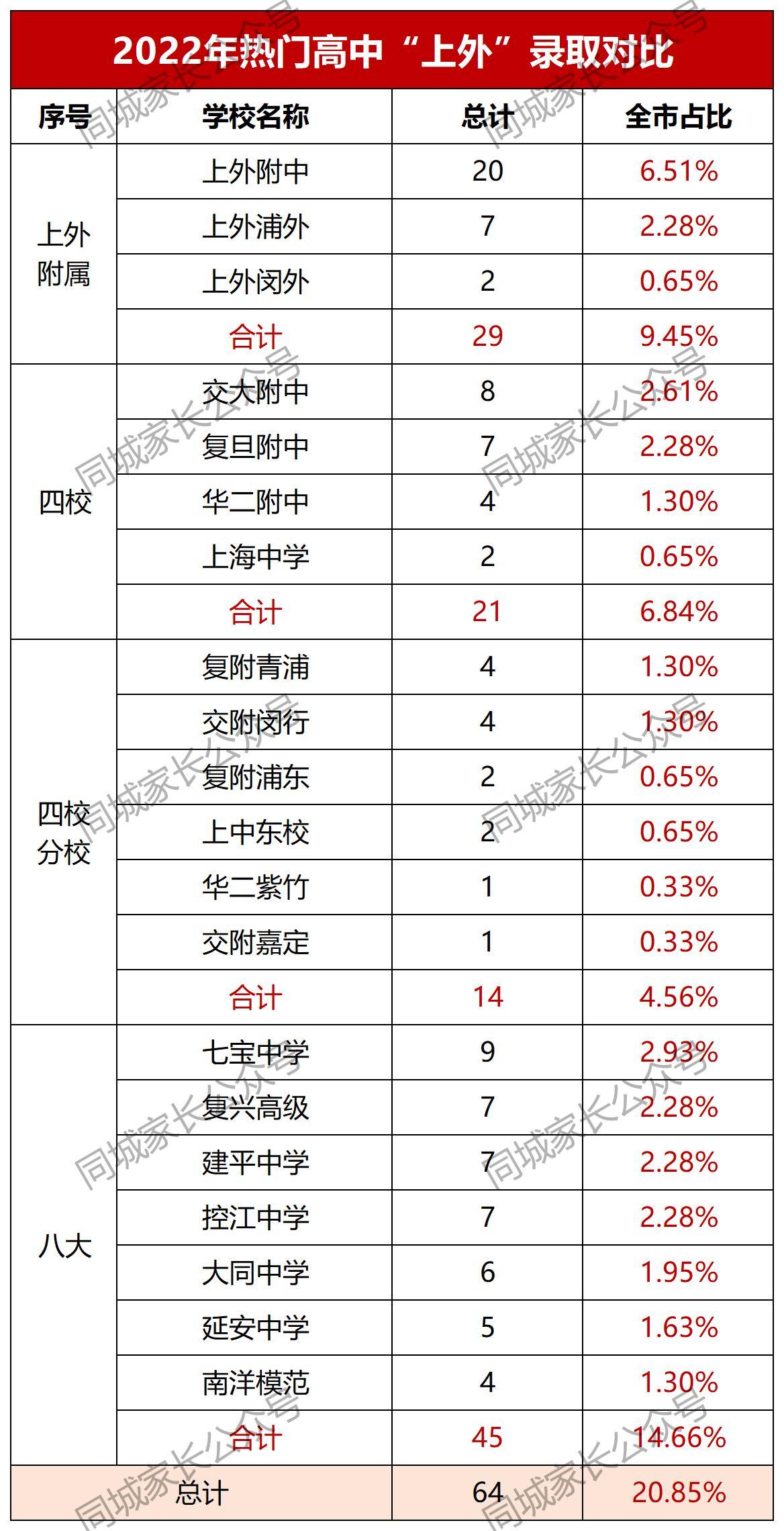 2022年,上外附校、四校、四校分校、八大,共被上外录取64人,全市录取占比20%。