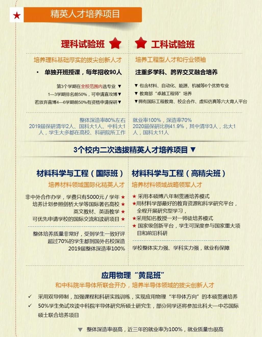 北京科技大学现有理科试验班、工科试验班、材料科学与工程高精尖班(本硕博八年制)、材料科学与工程(国际班)、应用物理“黄昆班”等精英人才培养项目,各有特色和亮点。