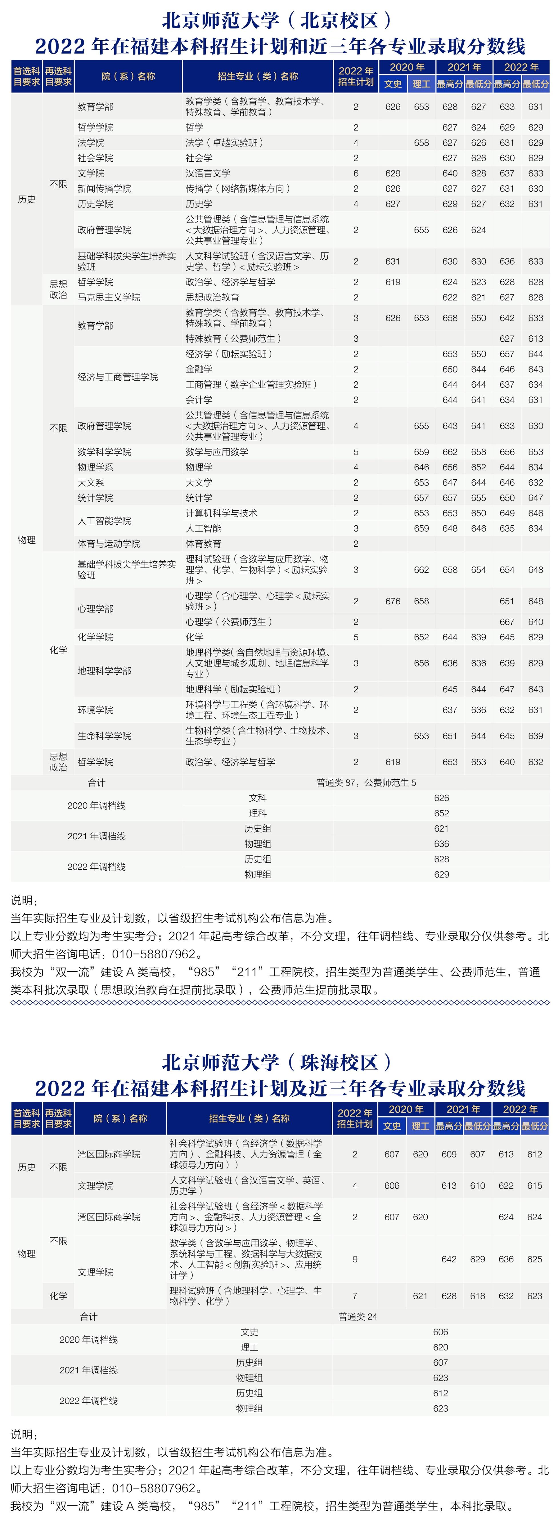 通过上表可以看出:北京师范大学在福建省的物理类和历史类录取分数都非常高,无论是历史组或物理组最低录取分数均超600分以上。北京校区2022年物理类录取最低分613分(省排名5613名),录取最高分达667分(省排名257名);历史类录取最低分626分(省排名295名),录取最高分637分(省排名115名)。珠海校区2022年物理类录取最低分623分(省排名3822名),录取最高分636分(省排名2137名);历史类录取最低分612分(省排名663名),录取最高分622分(省排名373名)。