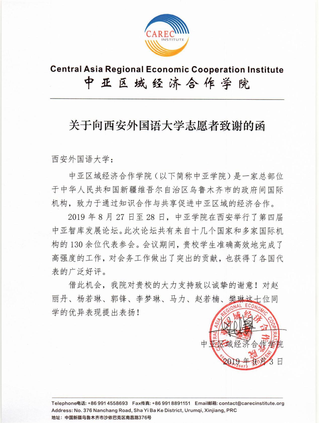 论坛结束后,主办方向西安外国语大学发来感谢信,对西外志愿者在服务第四届中亚智库发展论坛所作出的贡献给予充分肯定和感谢,对学校的大力支持致以诚挚的谢意。