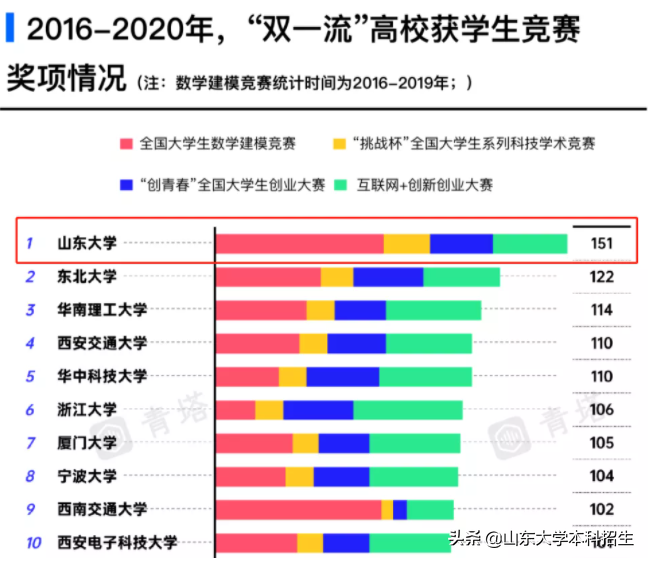学校的创新创业教育也取得了良好的成效,先后获评“深化创新创业教育改革示范高校”“大众创业万众创新示范基地”。聚焦于高等教育领域的第三方数据服务平台——青塔的一项统计数据显示,2016-2020年间,比较“双一流”高校学生在创青春全国大学生创业大赛、互联网+创新创业大赛、挑战杯课外学术科技作品竞赛和数学建模竞赛上的获奖情况,山东大学位列第一。