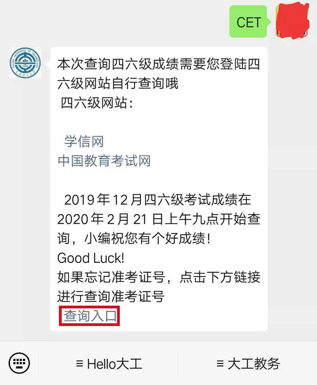 大连理工大学微信公众号后台回复:“四六级”,“46”,“cet”,“CET”,后台将自动回复四六级查分地址,同时在下方有四六级准考证号查分入口,如果忘记准考证号可以在准考证号查询入口凭借学号进行查询。