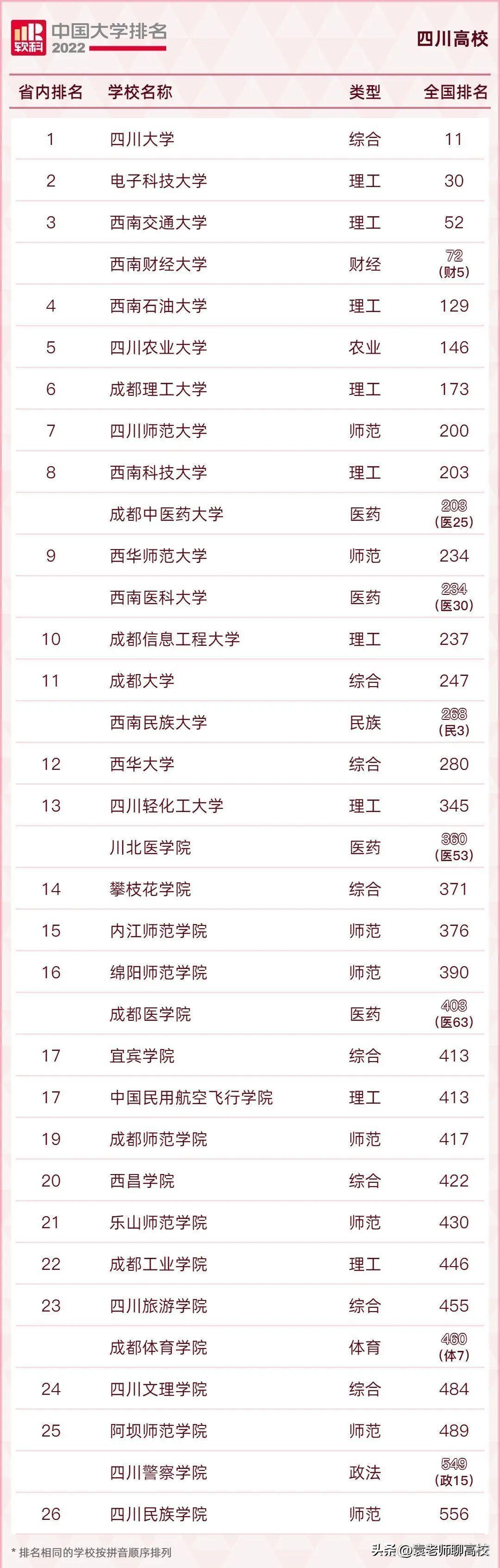 以2022年四川省软科高校排名来看,成都大学位居省内第11位,全国第247位,西华大学位居省内第12位,全国第280位,四川轻化工大学位居省内第13位,全国第345位!