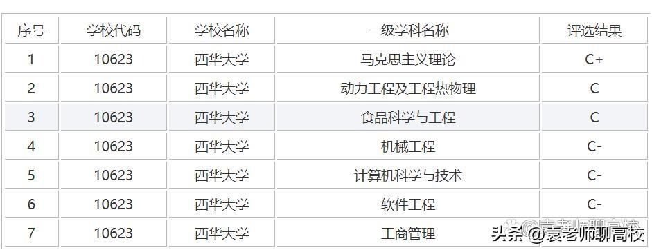 西华大学在第四轮学科评估中,有7个专业上榜,其中最好的学科是马克思主义理论,被评为C+,动力工程级工程热物理和食品科学与工程等两个学科被评为C,具体可见下图!