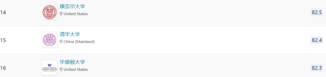 计算机前十名的高校中目前还没有中国学校的身影,最近的是清华大学,位列第15位。前后分别是美国的康奈尔大学和华盛顿大学。