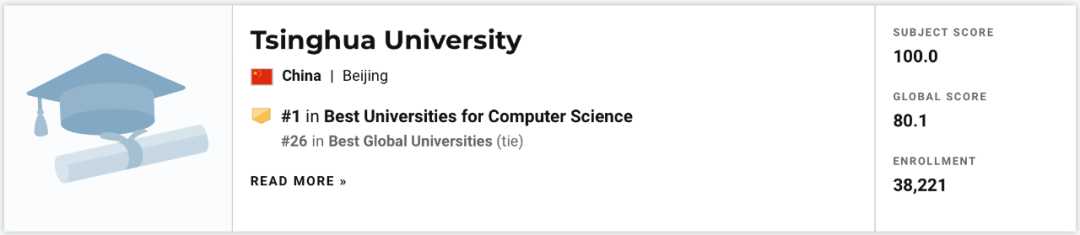 中国大陆共6所大学的计算机科学的学科排名进入Top 100,清华大学位列国内计算机学科排名第一。
