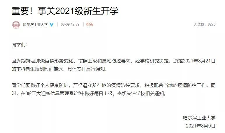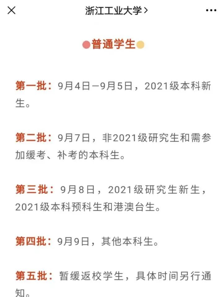浙江工业大学:对于2021级新生来说,原本定在8月22日开学报到,现在已经推迟到9月4日报到,而军训内容推迟到2022年再进行。