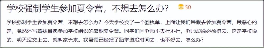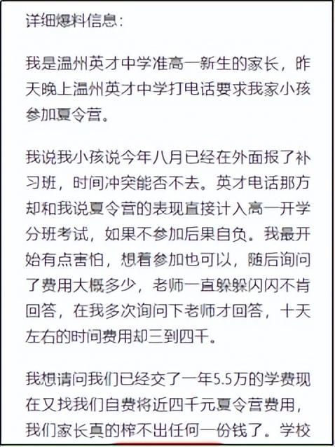 为何?因为夏令营的表现直接计入开学后学生分班考试的分数,直接和孩子将来的前途挂钩,不参加后果自负,用各种办法拿捏家长。