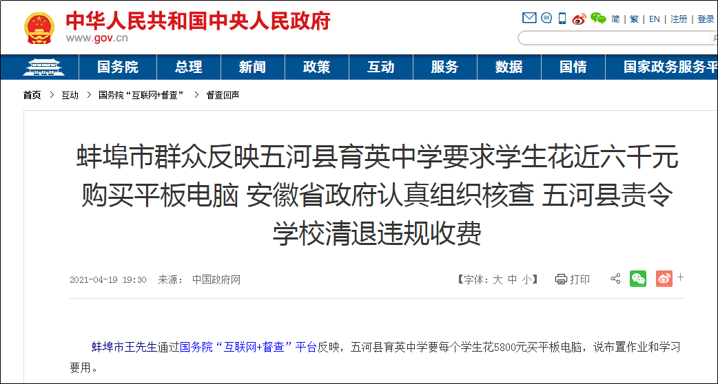 紧接着2021年,安徽蚌埠市也有人在网上举报,五河县育英中学要每个学生花5800元买平板电脑,说布置作业和学习要用。