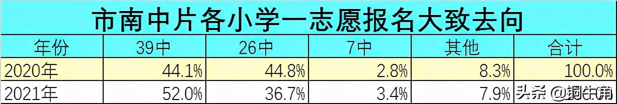 2021年市南中片小学一志愿报名去向为:36.7%的人在一志愿选择了青岛39中,52.0%的人在一志愿选择了青岛26中,7.9%的选择其他学区或学校,一志愿选择青岛7中的人数仅有3.4%。