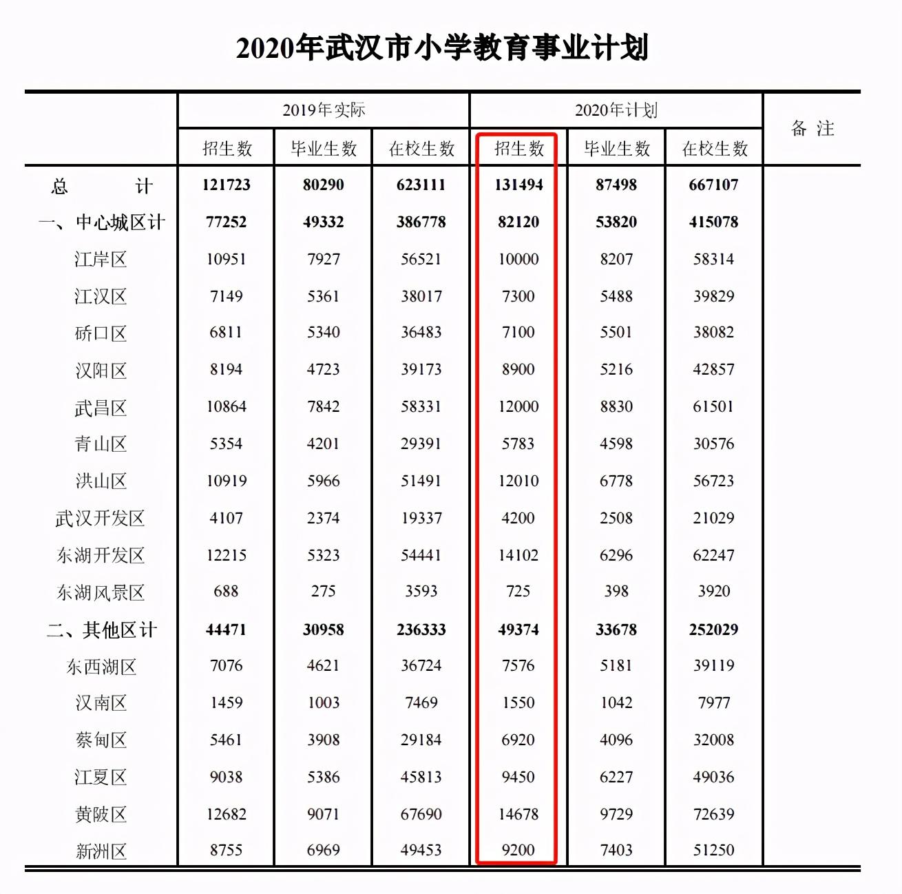 去年6月7日,市教育局官网发布《市教育局关于2020年武汉市各级各类教育事业计划的意见》、《武汉市2020年基础教育、中等职业教育事业计划》。对于义务教育阶段的家长来说,该文件说明了教育部门的计划发展目标,公示了2020年各区小学招生人数、小学毕业人数。