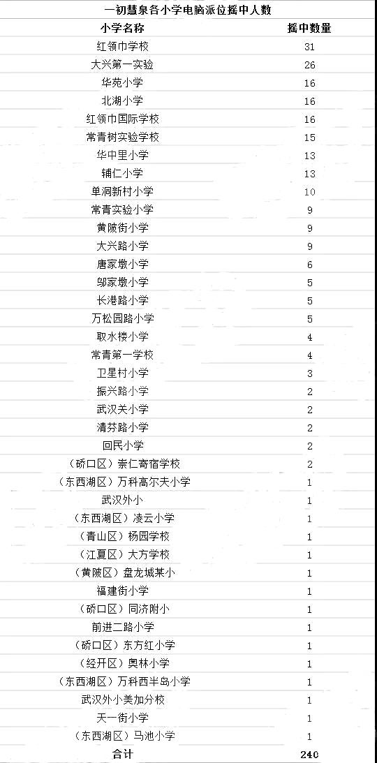 一初慧泉摇号报名人数1823人,派位计划招生人数240人,一初慧泉电脑派位摇中人数的双雄分别是红领巾学校、大兴第一实验小学,分别是31人和26人。