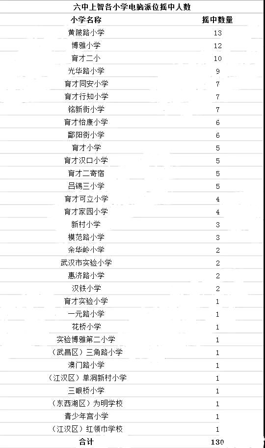 六中上智摇号报名人数919人,派位计划招生人数130人,占据六中上智电脑派位摇中人数前四名的小学分别是黄陂路小学、博雅小学和育才二小,摇中人数分别为13人、12人和10人。详细数据可查看上图及下表。