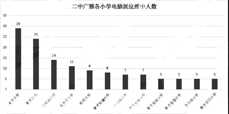 二中广雅摇号报名人数1293人,派位计划招生人数173人,占据二中广雅电脑派位摇中人数前四名的小学分别是育才小学、育才二小、沈阳路小学、长春街小学,这几所在区内都是极为热门的公办小学。