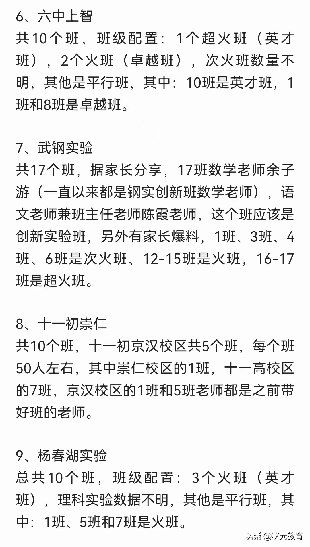 武钢实验2022新初一总共17个班,每个班50人左右,据家长分享的师资情况,17班数学老师余子游(一直以来都是钢实创新班数学老师),16班和17班应该是超级火班,其他班型情况目前还不完全明朗。