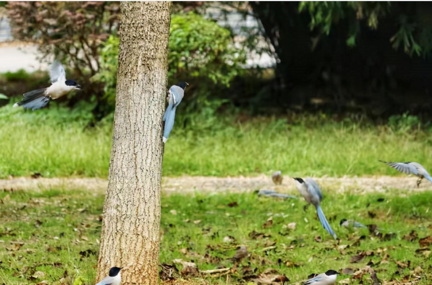 不同种类的鸟儿或停在树梢、或在地上蹦来蹦去,叽叽喳喳的叫声让偌大的校园变得热闹起来。疲惫时驻足欣赏,被它们美丽外表吸引的同时,内心也得到安抚。