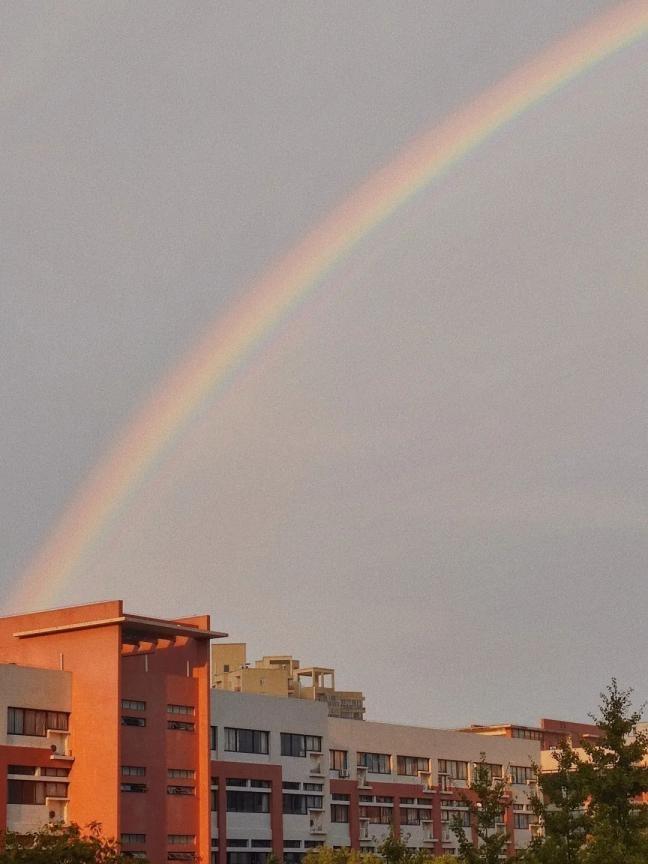 雨过天晴后,纺大的天空变得格外清亮。一道彩虹横架在天空上方,和红白相间的教学楼互相辉映着,为画面增添了几分梦幻色彩。彩虹是美好的象征,祝愿每一位纺大学子不负韶华、学有所成!