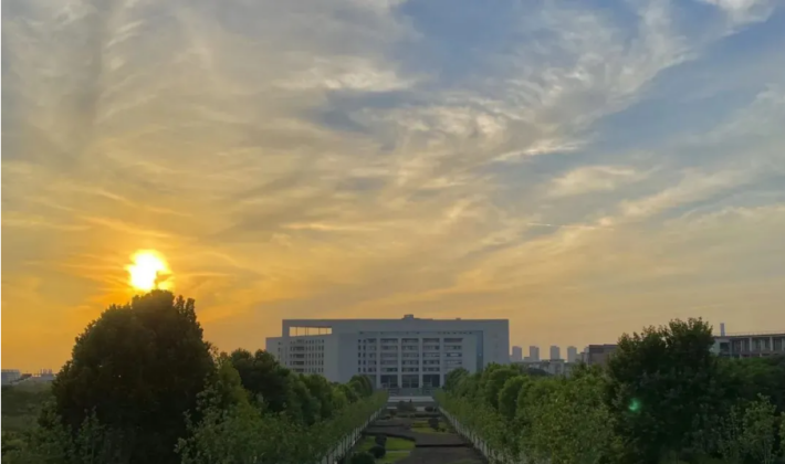 日幕降临时,纺大上空的夕阳与云彩显得格外浪漫。光影夹杂着时光,身心也慢慢地放松起来。在光与影的交织中,纺大的建筑也被映衬得气势恢宏。