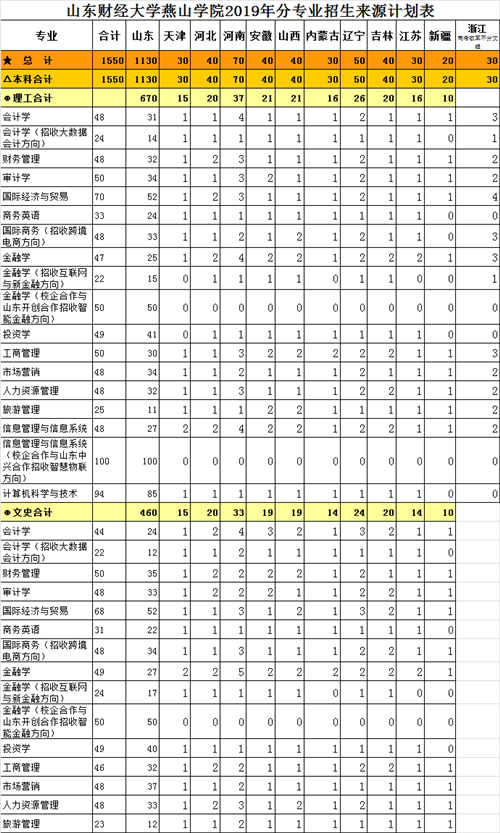 学校:学校2019年面向全国12个省(市、自治区)招收普通本科学生1550名(全部为夏季高考计划),面向山东省招收本科生1130人,省外招收420人。与往年相比,今年的招生计划总体保持不变,省内和省外的计划分布也保持不变。今年的招生计划分布在14个本科专业,具体可参考下表,考生填报志愿时,以生源所在地省级招生机构正式公布的计划为准。