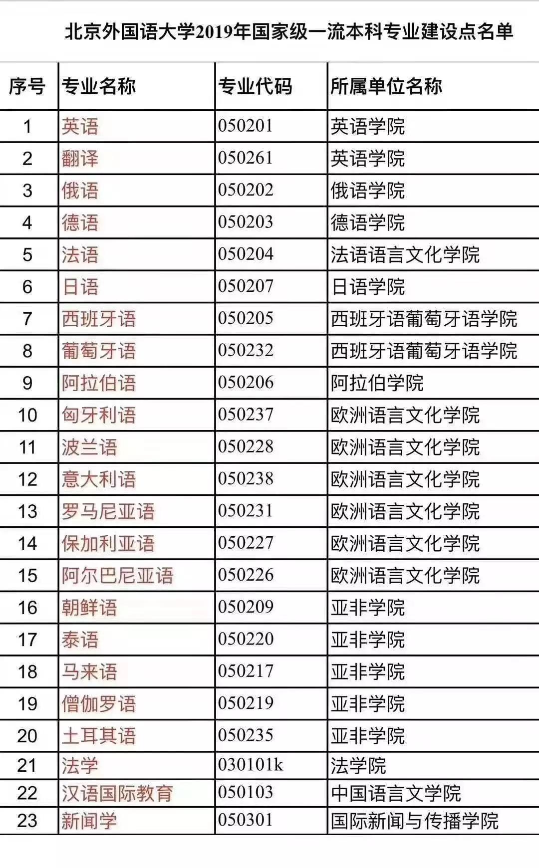 在教育部发布的《教育部办公厅关于公布2019年度国家级和省级一流本科专业建设点名单的通知》(教高厅函〔2019〕46号)中,北京外国语大学英语、翻译、俄语、德语、法语、日语、西班牙语、葡萄牙语、阿拉伯语、匈牙利语、波兰语、意大利语、罗马尼亚语、保加利亚语、阿尔巴尼亚语、朝鲜语、泰语、马来语、僧伽罗语、土耳其语、法学、汉语国际教育、新闻学23个专业入选国家级一流本科专业建设点。