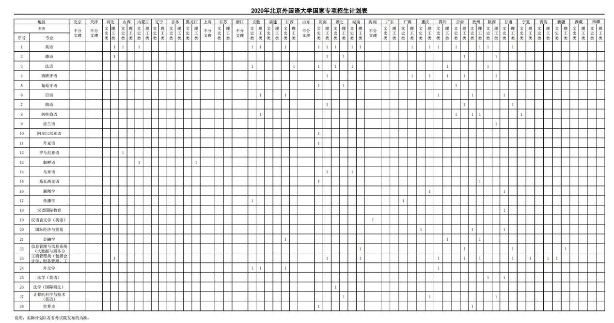 北京外国语大学作为我国高等院校中历史悠久、教授语种最多、办学层次齐全的外国语大学,是许多热爱语言学子理想中的学术圣地。目前各省高考成绩已经陆续揭晓,志愿填报工作也随即展开。本期推送,特为广大考生和家长整理了北京外国语大学2020年分省分专业招生计划——