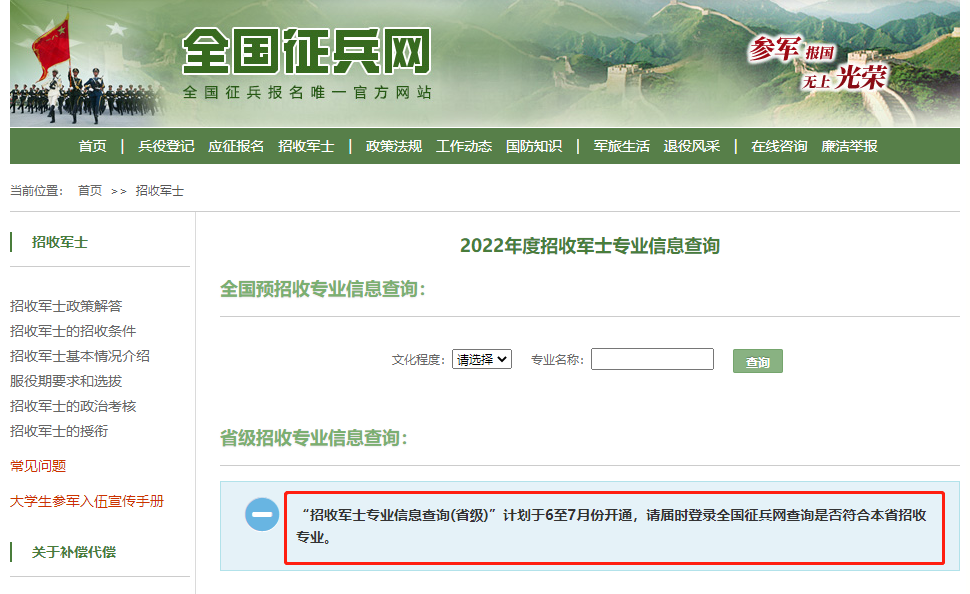 提醒:本次报名只是预报名。每年都会有部分青年咨询,为什么报名了却等不到体检通知?国防部征兵办公室会根据部队招收需求和网上预报名情况,分配各省招收任务,也包含招收专业。也就是说,没有收到相关通知,表明你的报名省市没有你所学专业的招收任务。