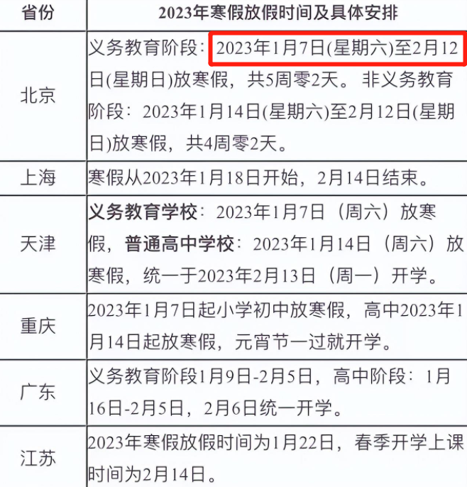 为了更好地保障学生们的身体健康,也为了避免出现冬季疫情反弹的情况,多个地区也公布了秋季学期的防控安排,并调整了教学任务,比如上海地区便公布,寒假时间从2023年的1月18日到2月14日,较往年有所提前,放假时长约为56天。