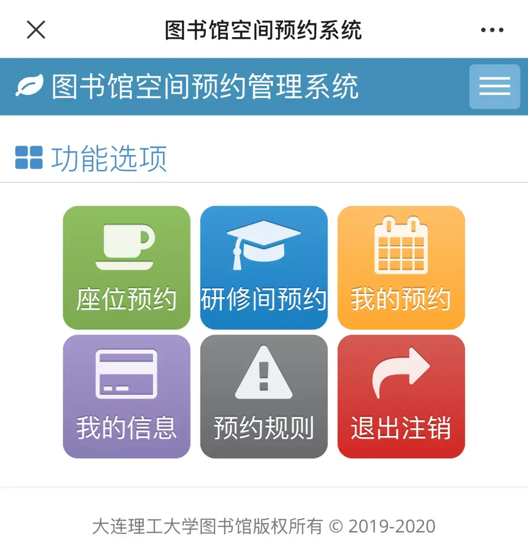 二、入馆须知1.根据疫情防控要求,为避免人群聚集,控制在馆人数,采取预约入馆选座制,读者可通过i大工平台或图书馆官方微信平台“大连理工大学图书馆入馆预约系统”进行预约,凭借预约码在入口处扫码入馆(详细使用流程请见下方说明)。2.各馆舍仅开放单侧通道(伯川馆开放北门,令希馆开放东门),入馆须网上预约申请,佩戴口罩入馆,接受体温检测,按照预约座位间隔就座,做好自身防护,避免聚集。如遇入馆和借还书高峰,请自觉排队并保持合理间隔。如出现发热干咳等疑似症状,请及时报告并接受处置。3.因研究间属狭小密闭空间,通风条件不佳,暂不开放。4.查新查收查引和知识产权信息服务等学科服务、文献传递/馆际互借、荐购和赠书等读者服务,均恢复线下服务方式,但鼓励优先使用网上申请网上办理等线上服务,以减少入馆和人员接触。暂不接待外来读者及各类参观聚集活动。伯川馆会议区恢复预约使用,但需控制会场人数,做好疫情防控。5.每天开馆前后,将进行全面消毒。开馆期间,馆内保持通风透气,公共区域定时清洁消毒。6.随着校园防疫态势稳定安好,图书馆将适时增加开放座位数量直至全面开放;若疫情出现不利变化,将根据学校要求及时调整开放方案。图书馆将及时通过主页及微信公众号发布通知通告,敬请留意。大连理工大学图书馆入馆预约系统使用流程