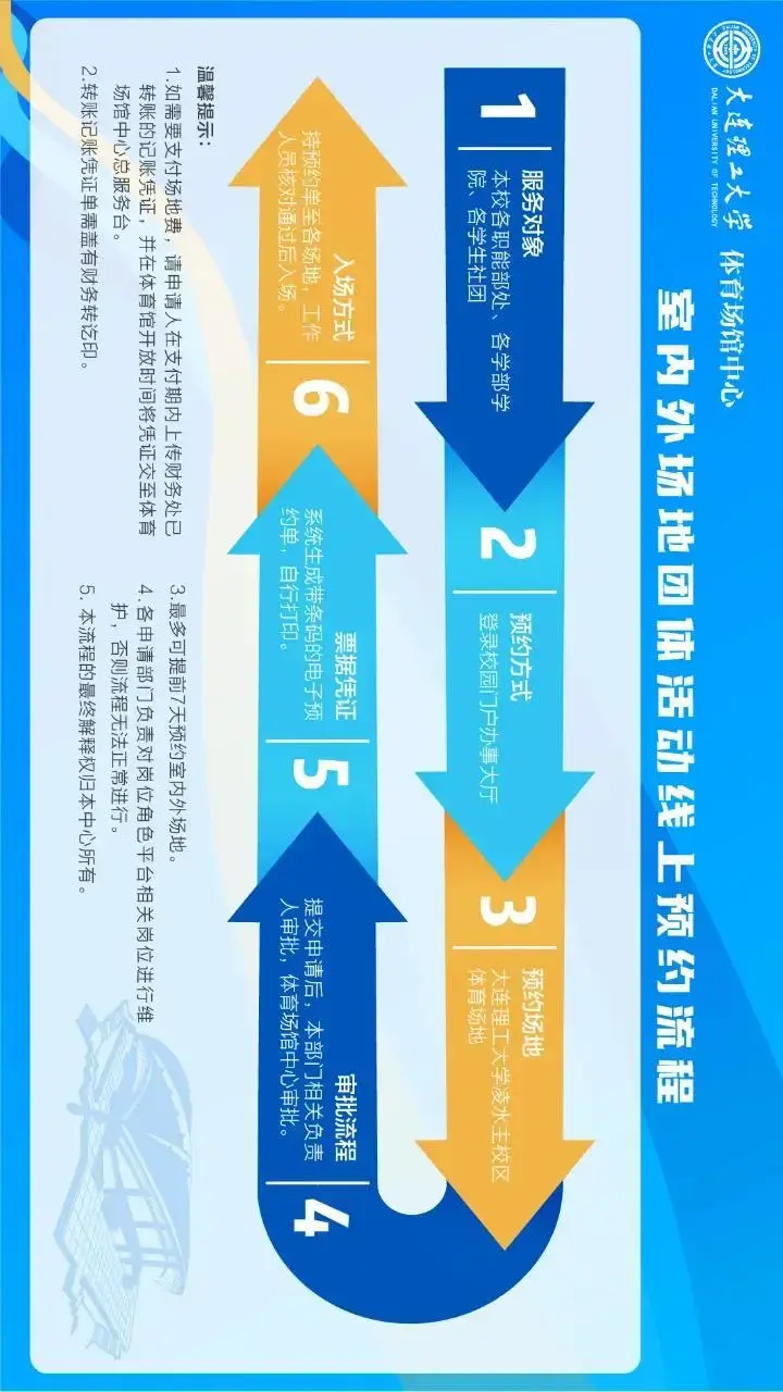 全校师生员工:体育馆将于近期逐步恢复开放,具体安排如下:一、9月7日起体育馆(除游泳馆)将对本校师生恢复开放,开放时间为:平日15:00~21:30;周末9:00~21:30。二、根据疫情防控要求,自9月7日零时起,体育场馆信息化管理系统上线运行,原则上师生须通过平台进行场地预定及支付,不接受现场业务办理,望理解。具体流程如下:1.个人预定方法:移动端:i大工APP->服务->体育场馆预订PC端:校园门户网站->办事大厅->体育场馆预订(个人)