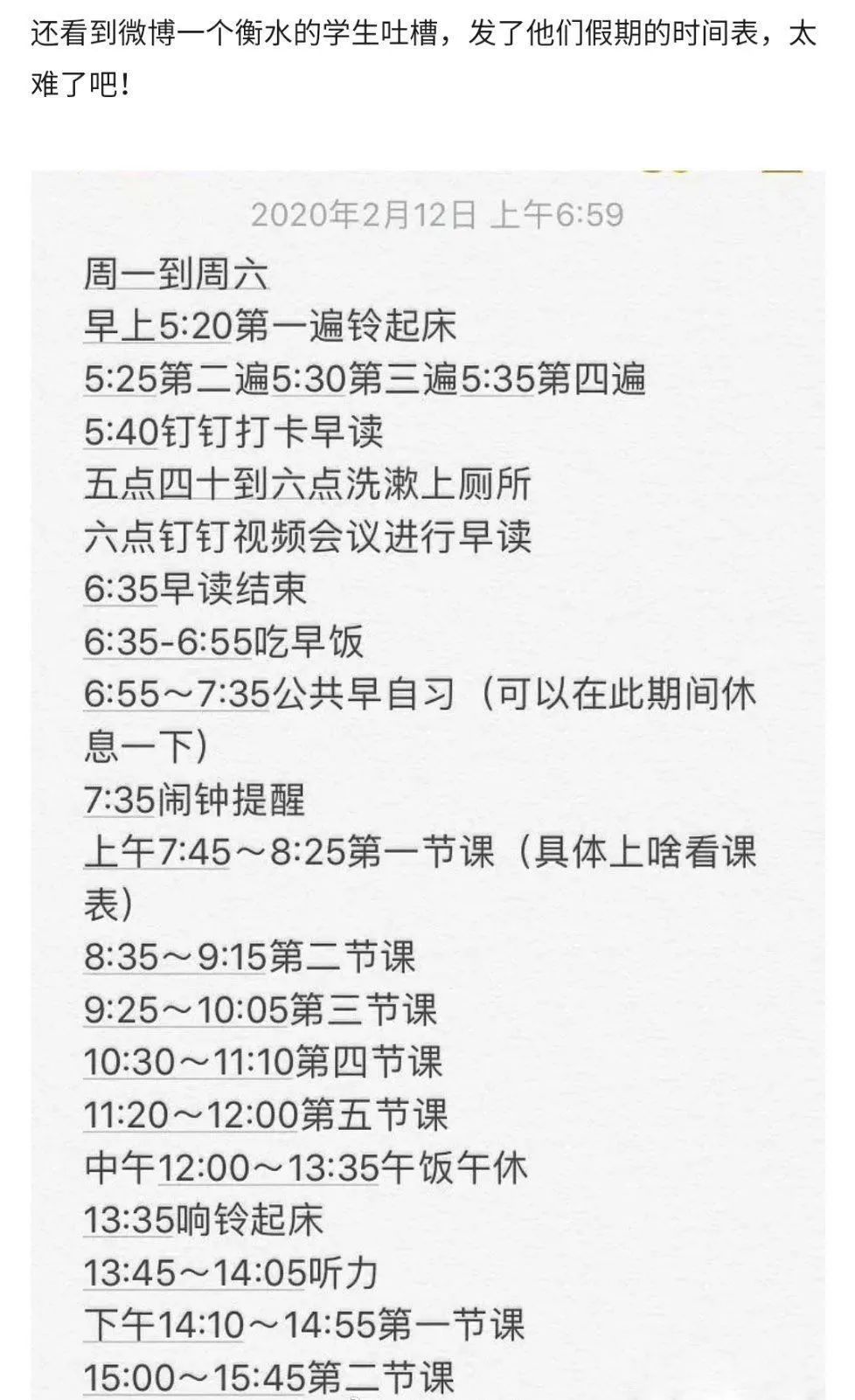 面对延迟开学,衡中开启”云叫醒服务“,老师每天早晨5点30分起床,然后通过线上提醒的方式,要求学生每天5点30分准时起床,家长把孩子起床学习的视频或者照片发到群里。