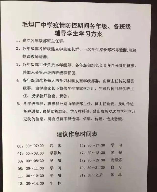 毛坦厂中学从学校层面,应对延迟开学,做了详细的部署,一方面从上到下,要求建立各种群:班主任群、家长群、班级群,要求家长晒孩子的作业,老师在群里发相关学习资料等。