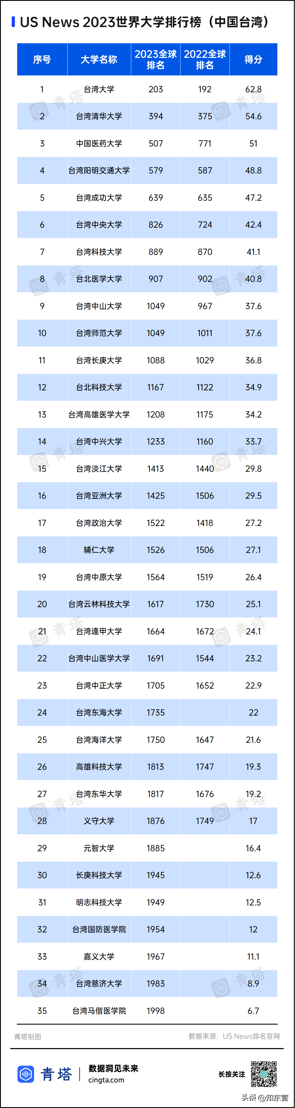 中国台湾地区共有35所高校上榜,其中排名最高的是台湾大学,排名全球203位。