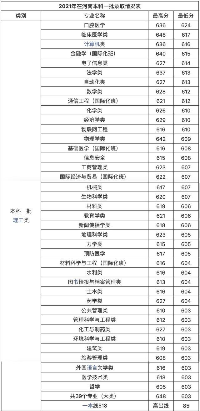 这是郑大2021年在河南省本科一批理科类录取分情况,录取分最低是603,有多个专业录取分是603(一本线518分,高出线85分),分别是公共管理类、管理科学与工程类、化工与制药类、环境科学与工程类、建筑类、旅游管理类、外国语言文学类、医学技术类、哲学专业。
