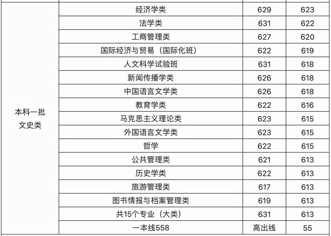 郑大文科类专业在省内录取分也不低,录取分最低是613分(一本线558分,高出线 55分),历史学类、旅游管理类、图书情报与档案管理类录取分都是最低的。而经济学类、法学类、工商管理类、国际经济与贸易(国际化班)、人文科学试验班、新闻传播学类、中国语言文学类则录取分较高。
