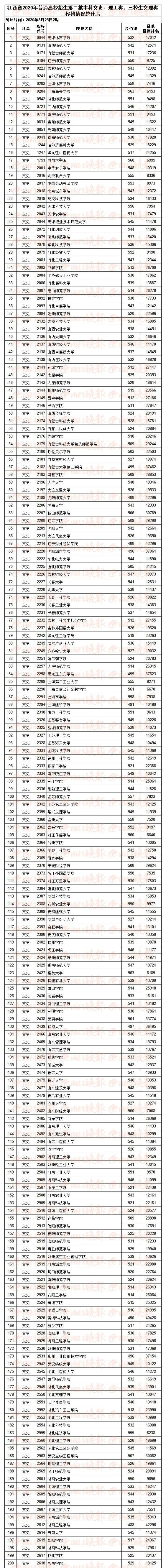 参加本批次录取的文史类院校共有626所,平行志愿投档满额的院校有593所,投档分居前的院校分别是: