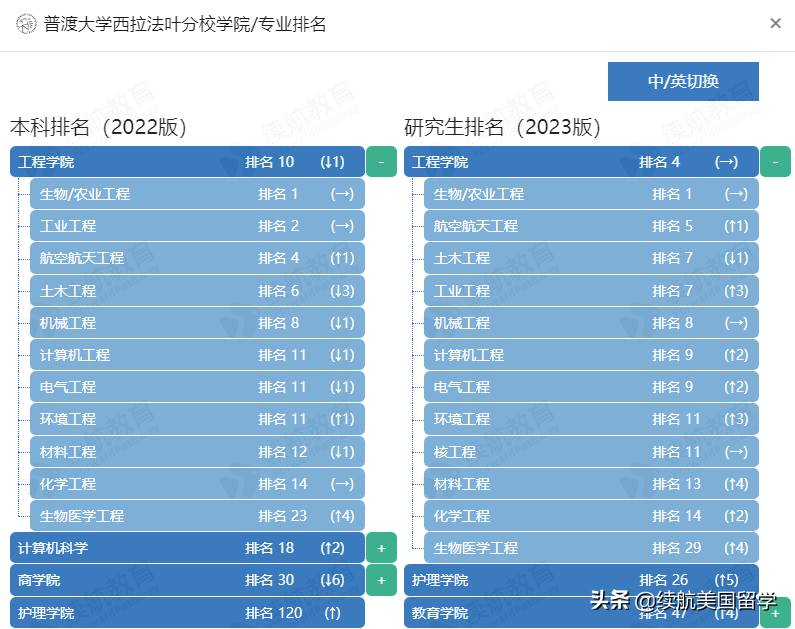如果你的专业方向是工程类,选择普渡大学简直就等于是掌握了“成功密码”。另外,普渡还有十多个学院等你解锁。更多关于普渡大学的申请要求和专业排名数据信息,欢迎访问美国留学中介续航教育美国大学数据库。