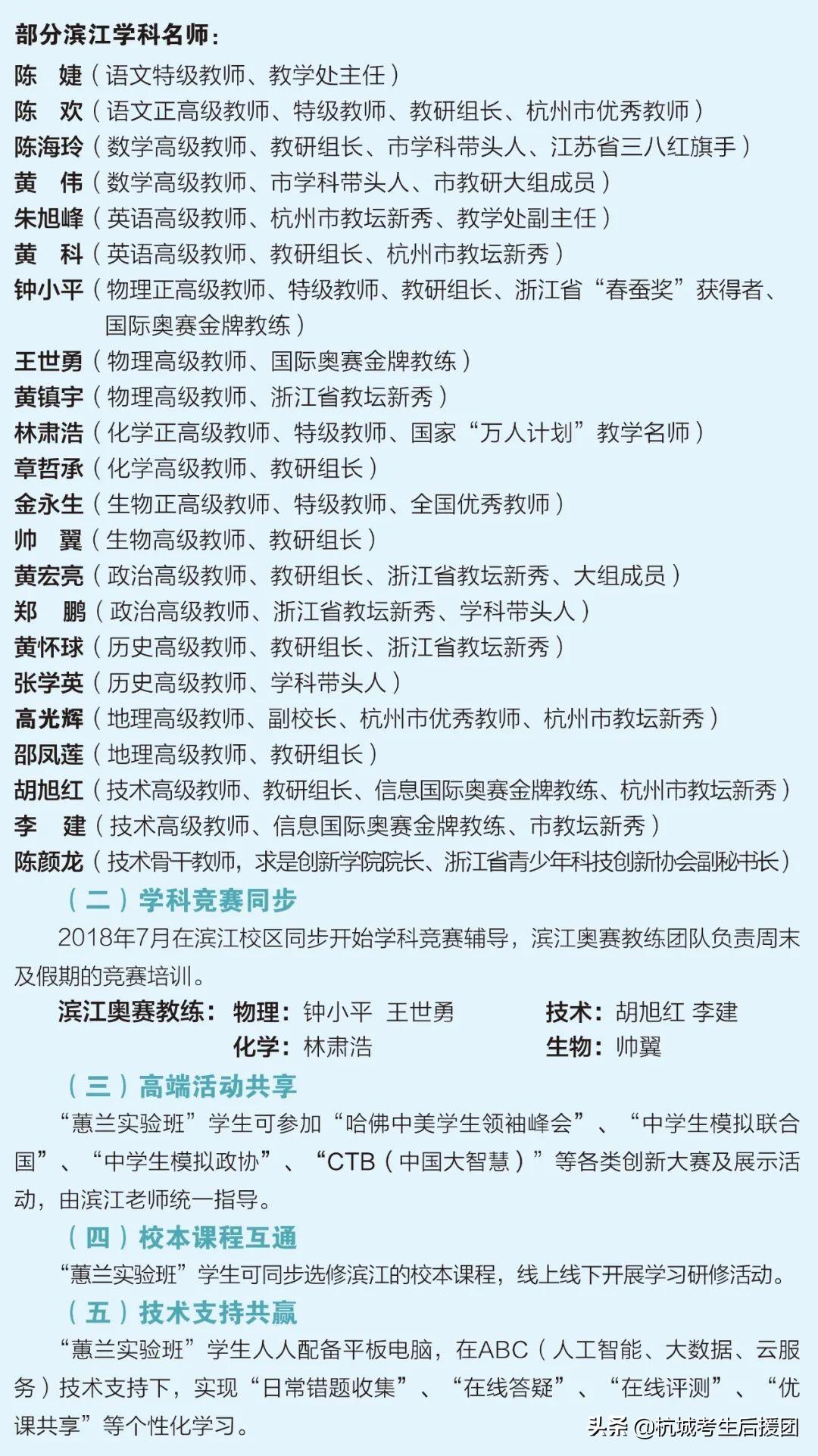 2021年杭高钱江校区2.0版“贡院班”“建功英才班”等特色实验班进一步实现了贡院校区师资优享,跨校区课程联动,依托杭高特级、正高级教师资源,配备优质师资团队,实验班以侧理为主。