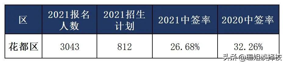 2021年花都区参与民校电脑派位的小学毕业生有3043人,9所学校共812个学位,中签率26.68%,较去年相比有明显下降。