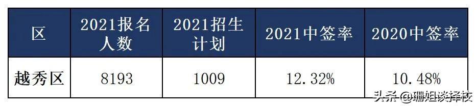 2021年越秀区共有8193人抢1009个学位,中签率12.32%,相对于去年稍微高出一些,不过整体来看,这一教育老区的竞争还是相当激烈。