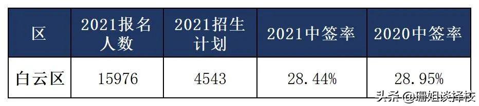 白云区2021年对外摇号计划是4543个学位,报考以上7所学校的有15976人,中签率28.44%,近2年摇中比率相对平稳。