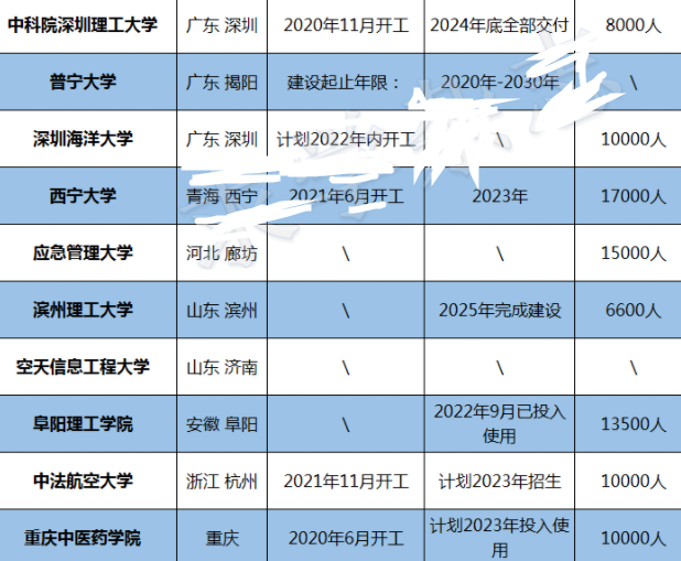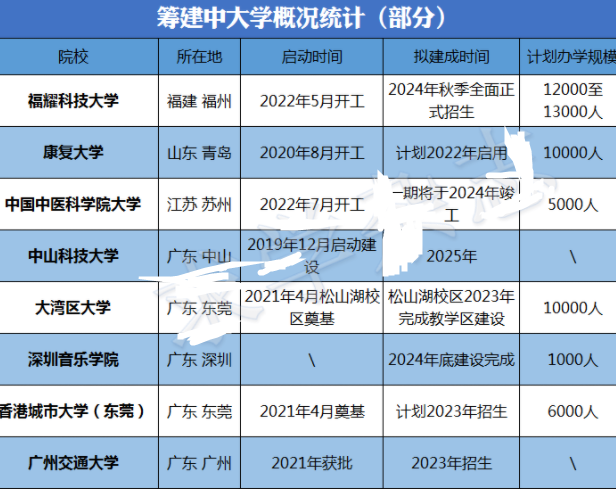 广东就“厉害”了,竟然有8所大学在筹建,地理位置都很好,中山科技大学2025年拟建成,招生规模1万人,大湾区大学明年预计完工,深圳音乐学院将于2024年建完,香港城市大学(东莞校区)明年就招生了,还有广州交通大学。