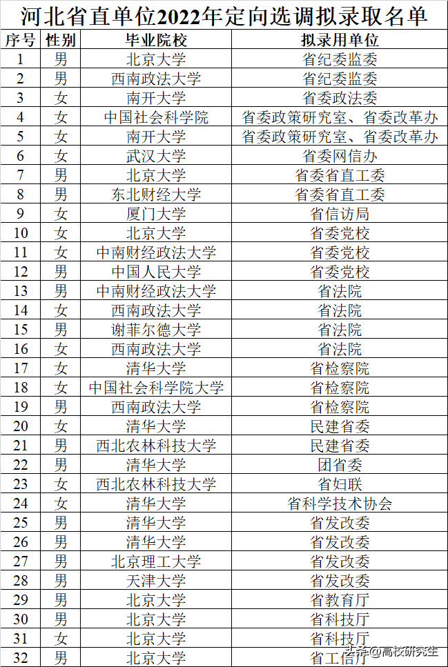 河北省直单位今年一共录取了72名定向选调生,其中北大20人,清华也有15人,意味着清北毕业生录取人数占到了总人数的近一半,可见河北招录清北生真的诚意满满!同时西南政法大学有4人被录取,追平了南开排在了第三位,确实表现非常亮眼!同时河北省直单位更加青睐男生,女生选择性真的少!