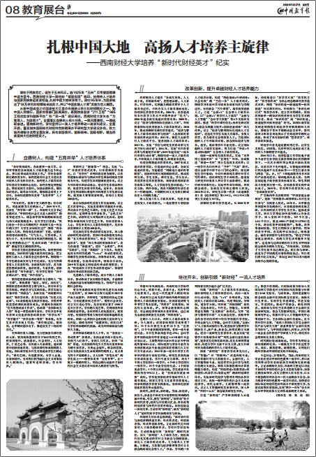 5月27日,《中国教育报》以《扎根中国大地 高扬人才培养主旋律——西南财经大学培养“新时代财经英才”纪实》为题,整版深度报道西南财经大学“新时代财经英才”育人成效。