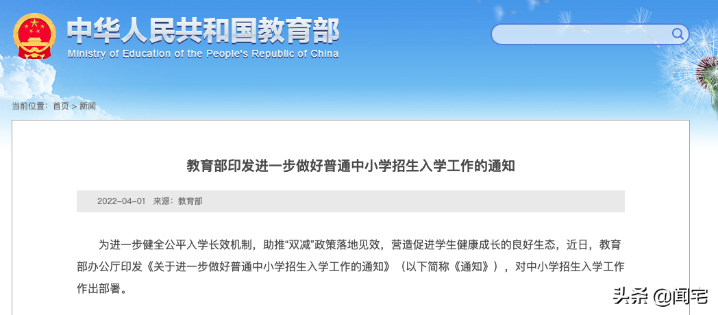 4月1日,教育部发布了“关于进一步做好普通中小学招生入学工作的通知”。