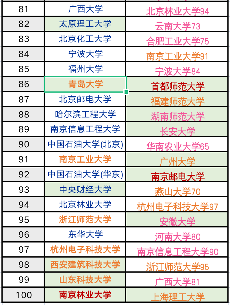 无特殊标色的高校均在两类评价机构的百强名单中,但是各院校的综合实力和研究生教育竞争力还是有些偏差的,有的上下浮动一两个名次如华中科技大学,也有的上下浮动比较大如西南大学综合实力排69名,但研究生教育竞争力却是41名,整整提升了28个名次,说明西南大学在研究生培养方面的优势是要更大一些的。